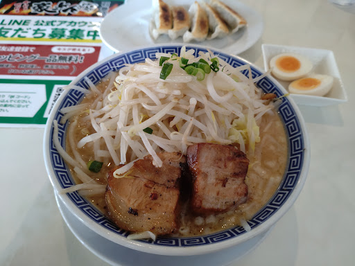 駐車場はだいたい10台程度止められる広さが有ります。 注文は食券で購入するスタイルですが入ってスグの入口にメニュー看板が有るので券売機前で悩む必要も有りませんでした。 ラーメンは店名の豪一を冠した味噌、醤油、塩ラーメンなどが麺の量やチャーシューの量別に選べる他に坦々麺や煮干しラーメン等があります。盛りが多い此方のラーメン屋さんで特質すべきは女性向けのボリュームのメニュー用意されている事。ウチの嫁さんは小食なのでコレは非常に助かります。 店舗は以前レストランだった建物をリノベーションしている為にカウンター席テーブル席が多く用意されていて広く店内の雰囲気は以前の店舗の名残りが有ります。 今回注文は自分もそれ程大食いでも無いので味噌の豪一麺中と嫁さんが女子味噌豪一麺(2/3)に餃子を一皿注文しました。 御昼回って13時過ぎの利用で客の入は他に4組程度、注文から届くまでの時間帯は普通位でした。 見た目の印象は丼は小さめだけど真ん中にモヤシが山の様に盛られていて、厚切りのチャーシューに店名の豪一を冠している事もあってある程度こんな味なのかな~って勝手なイメージが頭に有ったんですけど・・・・・一口食べたらイメージとは全くの真逆でした。 チャーシューの見た目で相当濃い味なのかな~って思ってたんですけどね。なんか全体的に味が薄い気が。 豪一って名前だから相当ガツン!!って来る味のイメージ強かったんだけれど実際のラーメンの味としてはゴメンなさい、正直名前負の印象が強かった感想でした。 スープだけ飲んでみるとスープはワリと濃い目の良い味してる印象なんだけど~・・・なんだろうな・・・ラーメンとしての全体的な食べ終わった頃の印象と感想としては記憶に無いって言うかコレと言った印象が残って無いって言うか・・・・なんだろう・・・モヤシじゃないかな。味の無いモヤシの主張が大き過ぎるような。 ボリュームに関しては間違い無く...