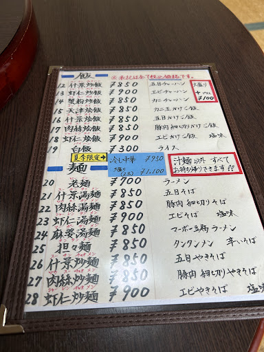 Read more日曜昼13時過ぎに来店。店内はほぼ満席でした。 メニューに写真が無いので文字だけでの判断。味付けは醤油ベースや塩ベースなどの表示も無しです。 五目や豚肉細切りの餡をご飯かラーメンか焼きそばに乗せる違いなのかな? 豚肉細切りラーメンは優しい味わいでした。濃いめ好きな人には物足りなさがあるかな、、、。 五目焼きそばも優しい味わい。 炒飯はふわふわして美味しい! 今度食べるなら炒飯1択! 特製餃子は600円にしては小ぶりで特製ダレが付いてきます。柑橘系の香りもして後からピリリと辛味がきました。 お醤油でいただきました(^^) 席は円卓、4人席×2、2...
