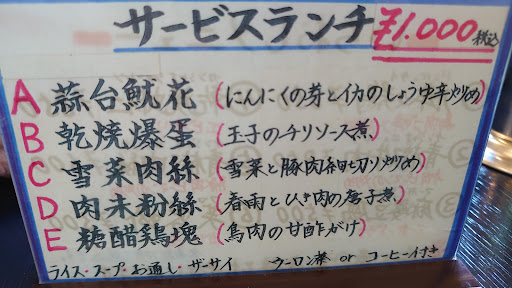 前々から気になっていて今日やっとお昼ごはんに行ってきました(^^) 店内にはテーブル席と個室があり、数は多くはありませんが回転が早かったのですぐ座れました~ 餃子、麻婆豆腐、豚肉細切り焼きそば、五目チャーハン、エビそばを注文 餃子はモチモチで、特製のタレによく合ってました!タレが何味かはよく分かりませんでしたが…(´・ω・`) 麻婆豆腐は辛さ控えめで食べやすかったです 焼きそばは麺が揚げられていたのでパリパリの食感 甘めのタレだったので飽きることなく食べられます(^o^)/ 五目チャーハンは少し味が濃かったと思いますが美味しくいただきました エビそばは野菜がたっぷりで、麺は細麺だったのでさっぱり食べれました 中華料理なので多少の油っぽさは勿論ありますが、今まで食べた中華料理で...