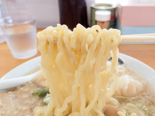 よく縮れた太麺は、加水率が高く、ツルツル。 やや熟成させているようで、歯に少し貼りつく感じがあった。