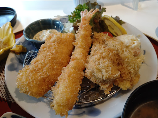 石巻元気市場の向かいのお店で10台程度止められる駐車場が有ります。 店内に入るとすぐ会計が有って通路が左手と正面にのびていて何方側にも席が見えます。 何方側に行けば良いのか怪訝に思ってると店員さんが来たので案内されると思いきや特に案内されず、よく見てみると左側には団体客らしき姿が見えたので奥へ。 扉を開けると別の店員さんがいたので席に案内されるのかと思いきや此方も特に案内されず何処まで客席が有るのかも分からない初見の自分からしてみると不案内な店だなあと言う第一印象。部屋に有る6人掛け✕3もしくはカウンター席が大体6人分の何処でも適当に好きな席に座って良いらしいです。 もしかしたら団体客の対応で忙しく手が回っていなかったのかも知れません。 店内の雰囲気は今時なお洒落な構えをしていて暗めな照明の効果も有って落ち着いた印象でした。 ただ気になったのは椅子。 白い荒目の生地が最初見た目模様なのかと思ったら汚れでした。 こんなにお洒落なお店なので、汚れの目立たない椅子に変えた方が良いかなぁと思いました。 席に付くと窓越しにウッドデッキが見えて其処に何処からか結構な数のニャンコが集まって来ます。 偶に耳の一部カットされてる地域猫なんかもいたりするのでもしかしたら御飯貰ってるんですかね~。 メニューを見るとお高めな価格帯。 今回は俺が海鮮ミックスフライ、嫁さんが新鮮!お刺身定食を注文しました。 他の方の投稿したメニューと比べると多少値上がりされている様です。 提供される迄の待時間は遅くも無くて早くも無かったのですが、連れのメニューが届いてから俺のメニューが届くまでの時間は少し長かったかな~と言う印象。 実際に食べてみた個人的な感想としては俺のミックスフライは最高の美味しさ!!海老フライは当たり前としても白身魚のフライは外サクサク中ホロホロで箸が止まりませんでした。 タルタルソースも美味しかったのですがテーブル備え付けのソースが個人的には大好きでした。 嫁さんの刺身定食ですが運ばれて来た時の印象は、少なっ!!コレで1500円!?でした。 味見させて貰ったらプリプリで美味しい新鮮な刺身でした。 ホタテ好きな嫁さん曰く『ホタテの刺身がスゴイ美味しかった』らしいです。 が、ヤハり1500円は高いかなぁ~って思います。 店の全体的な印象としては料理の味は個人的に相当美味しいと思います。 なんとなく接客で多少のマイナスな印象ヲ受けてしまいましたがトータル的にフライを食べるなら此処が良いよね~と...