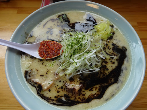 2020.02 オープン以来2度目の来店。 平日でも相変わらず昼時はお客様結構いますね。 苦手の食券購入してしばし待ちます… 今回は みそ黒マー油ラーメン全部のせ¥1,100-にしました。 みそ味は大抵無難!?に美味しいので(^^;)、基本的にはあまり選ばないのですが、今回一緒に行った人の知人が絶賛してた、との情報によりみそ味にしました。 全部のせは玉子、チャーシュー、キャベツ、メンマ、ちょいネギ、レンゲの辛味噌という具材。 …普通に旨い…でも… やっぱりみそ味はこうなるよなぁ。 みそ味も色々ありますが、こちらは比較的甘めの白味噌がベースなのかな。 辛味噌入れずに食べるとかなり甘いです。 マー油と辛味噌が良いアクセントになってますね。 ただ辛味噌全部溶かないとレンゲが使えないのはちょっとね… あと¥1,100-は少々お高い。 ご馳走さまでしたー。