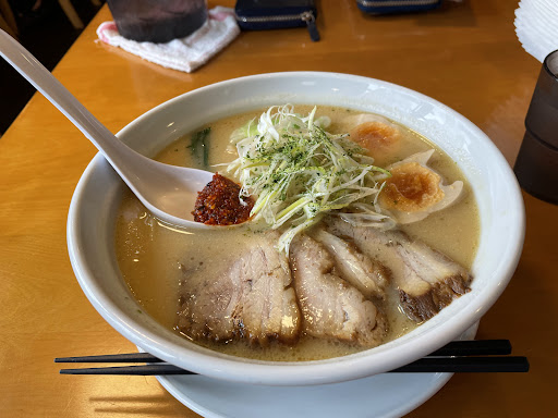 Read more個人的な好みですが結論から言うと文句無しに激旨。 注文は俺が味噌黒マー油の全部のせに嫁さんが味噌ラーメンです。 まずトッピングのでチャーシューは俺好みの程良い厚さで、かつトロットロ。 そして味玉も美味しい。 蓮華に乗った辛味噌を黒麻油の浮いた味噌スープに溶かし込むと適度な甘辛さで食欲が沸き立ちます。 あ~辛いなぁと思いつつも箸が止まりません。 最終的にはスープ迄完食。 1つだけ言えば俺はキャベツが苦手なので具材にキャベツが入っていたのがちょっとなって位の話で文句無しに御薦めできる良店だと思われます。 ただ比較的熱い食べ物と辛い食べ物が苦手な嫁さん曰く、蓮華に辛味噌を乗せるのは反則だそーです。 辛いのが苦手だから溶かしたく無いけれど蓮華に載せられた辛味噌を全て何とかしないとスープを飲めないからやむ無く溶かして辛さと戦ったらしいです。 丁度良い辛さだったけどなぁ。 まぁ好みが有るので小皿に乗せて貰えれば好きな辛さで楽しめるは楽しめますね。駐車スペースは軽く10台以上は止められる広さが有ります。 店内の雰囲気としては入ってすぐ消毒を求められ定期的に店内の換気をされている様でした。 注文は食券での注文になります。 券売機脇には両替機が用意されているのが割と珍しいなぁと感じました。 席は6人掛けと4人掛けが其々2卓づつにカウンター席が7.8人分位用意されていました。 人の入りはかなり良い様に見えました。 席の空き数と人数の関係で後から入店した客が案内される可能性も有るようです。