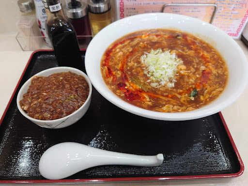 注文はスーラータンメンとミニひき肉丼のセットです! スーラータンメンはデフォでも程よく酸味の効いた少し餡掛け感のあるスープで、具材と相まって美味しいです。 お好みで黒酢をかけると酸味をさらに増して、 まろやかな味を楽しめます。 個人的にはデフォの味が好きでした😋 麺は餡掛けベースのスープのせいか少しやわらかめの印象ですね。