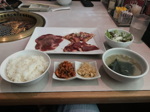 焼肉三種盛りランチ1408円(税込)です。 タン塩、助格カルビ、漫遊カルビ、ライス、もやしのナムル、キムチ、わかめスープor味噌汁が付いてきます。