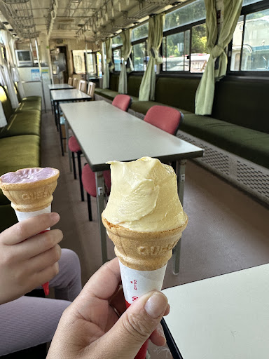 ソフトクリーム種類がたくさんで、私はマンゴー、こどもはブルーベリーヨーグルト、イチゴなどを注文。電車の車内にテーブルと椅子が置いてあり、そこでカフェで購入したものが飲食可能です。