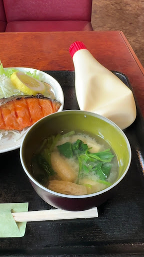 本当に お店はココだけなんだよねえ。 お店の横に駐車場あります。 定食は、2時まで(昼のみ) お腹空いていたので 鮭定食 たのんじゃった。 900円 フロアは カウンター席とテーブル席 明るい店内。 キャベツの千切りに横たわる鮭が出てきた。 お漬物 ごはん みそ汁 マヨネーズがドン♪