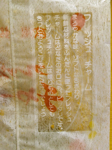 フレッシュチャームは小ぶりなブッセのようなもので、甘さ強い。カステラ生地だろうか。外側もベタベタするほどシロップ?のオブラートあり。オーソドックスだが素朴な味わいで安価だしよい