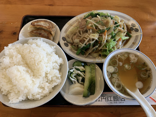 野菜炒め550円。ライス300円を注文。 野菜炒め、ライス、スープ、お新香、サービス餃子2個が到着。 事前にサービス餃子2個が(サービスライスはラーメンだけ?)付くとの口コミを見ていた。