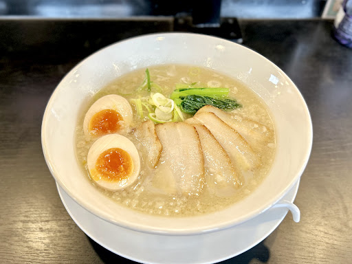 2025.05.10 20年近くぶりの幸楽苑さんで、こちらの潮来店は初になります。 期間限定の塩とんこつラーメンをオーダー。 ちらほらと背脂の浮いたややトロ味のあるスープが中太多加水麺にほどよく絡みます。 とても食べやすいラーメンでした。