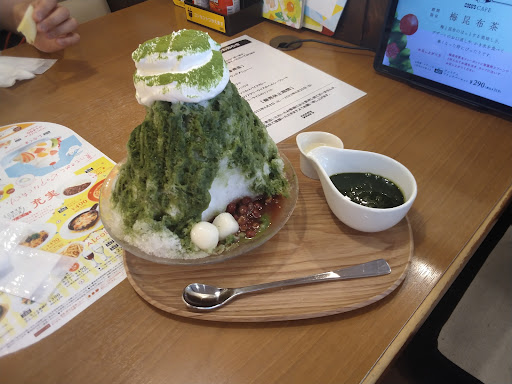 県道42号線沿いにあるココスです。広い駐車場もあります。8月の猛暑だったので、かき氷を食べに午後3時頃家族2人で来店しました。かき氷のメニューは豊富でサイズも普通サイズ(all759円税込)とミニサイズ(all539円税込)があります。私は宇治金時の普通サイズを、奥さんはしろくまのミニサイズこぐまを注文しました。提供された宇治金時は、普通サイズと言ってもかなりボリュームありました。ミニサイズでも十分だと思います。それに提供された時点で抹茶ソースはかかっていましたが、別容器に抹茶ソースと練乳が備え付けられており、追い足し出来るようになってます。抹茶も濃厚だったし、氷もふわふわでとても美味しかったです。こぐまもリンゴやキウイ、バナナ、みかん、イチゴ、グレープフルーツが盛り付けられてとても美味しかったそうです。かなり涼めました。会計ではdポイントが使えるとのことで、全額ポイント払いで済ませました。ココスはドリンクバーも安価で種類も豊富だし、スイーツ系も充実していて、...