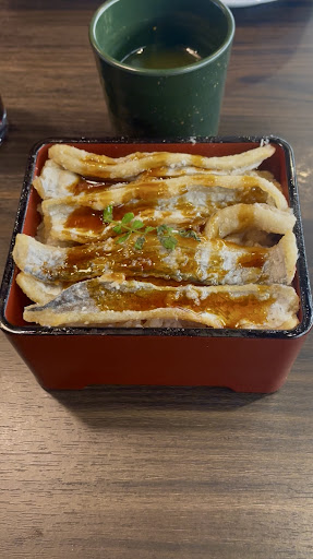 ◆太刀魚重 780円 身の薄さからして小さめの太刀魚だろうけど、6~7本の切り身の天ぷらが乗っています。 メニュー写真と比べても同じで身がたっぷりなのが良い^^ 天ぷらを頂くと、片栗粉のようなサクサクした軽い衣で太刀魚の繊細な白身はふわふわで美味しい♪ ただ、甘タレは鰻のタレとは違った味わいで、この甘さは好みではない。 でも太刀魚は美味しいので、次回はタレ無しで注文して、卓上の甘タレをかけて食べようかな。 お重自体はそれほど大きくないけど、満足できるものでした。