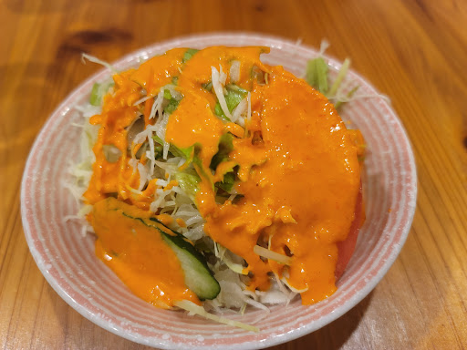 具材も少なめが普通ですし シンプルな構成の料理。 サラダは定番のオレンジ色のドレッシングで販売しているそうです。 甘い甘いドレッシング。