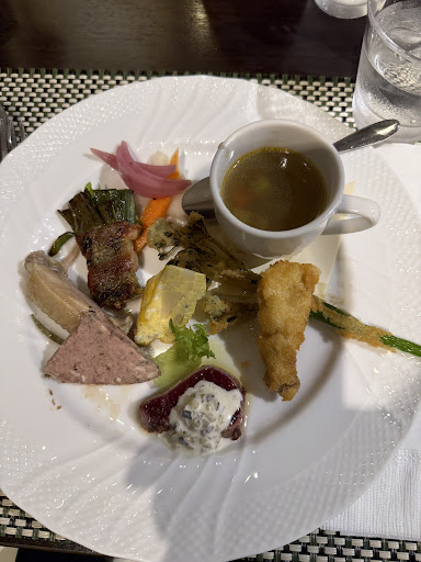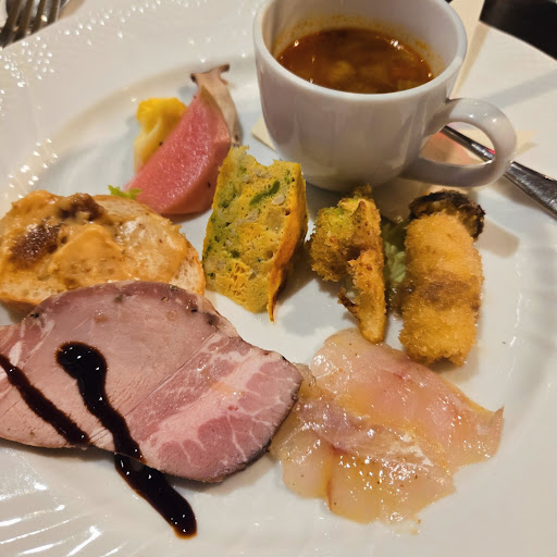 前菜は10種類程度乗ったプレートでした!(どれも美味しい) 中でも印象的だったのが、冷製かぼちゃスープで、口にするとふわふわでとろけていく感覚がありました!新たな発見でした🎃