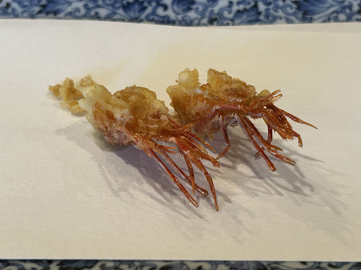 ■才巻海老×2 レアな火入れでサクッと揚げられていて小ぶりな身の甘さも楽しめる。