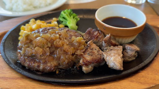 ハンバーグには醤油ベースのジャポネギソースがかかっていて、カットステーキはポン酢でいただくとのこと。スープバー付きですが取りに行くのを忘れました。