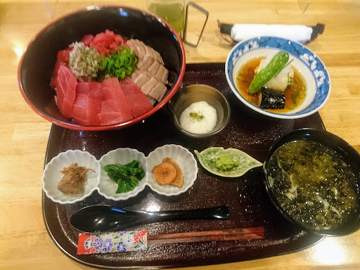 客は自分のみ。若干不安になりながら待っていると、ジュワワワワ〜♪ あれ?揚げ物の音?マグロ丼なんだけどな? 思ったより広い店内、手際よく調理をする調理場、美味しいものが出てきそうな雰囲気(どんなんや笑)にソワソワしていたら、 感染予防の透明パネルの横からお盆にのってやって来ました。 赤身、中トロ、炙り中トロ、中落ち(?)の丼!!! 傍らには揚げたての揚げびたし!さっきの音はお前だったのか。 揚げ出し豆腐うまーい。揚げ茄子うまーい。なんか辛いのうまーい。 そして本丸、ツヤツヤのマグロに擦りたてのワサビを載せて、醤油をつけて丼のご飯と頂きます。