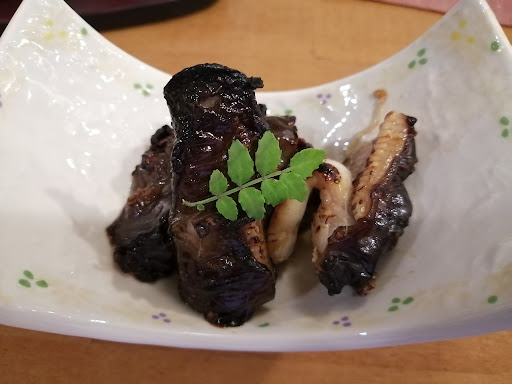 丸茄子の甘辛味噌焼きは納得のおいしさ。 刺し盛りは バイ貝、キジハタ、カマスの炙りでした。 それぞれ甘味、旨み、歯応えが有り美味しくいただきました。