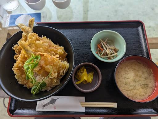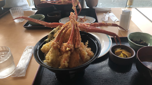 Read more国道沿いの高速道路の下にあるドライブインの中にある海鮮中心のレストラン。 海鮮丼を注文する人が多い感じでしたが、前日にお寿司をたっぷり食べてしまったので、今回火の通ったものをということで、蟹の脚がたっぷりのったかに天丼とエビフライ定食を頂きました。 かに天丼は写真に違わぬすごいボリュームの見た目ながら、少し細い脚なので実際の可食部は少々少ない感じでした。 エビフライは少し揚げ過ぎな感じのしっかり茶色でしたが、味はまぁ問題ない感じでした。 一番の減点はご飯が少し固すぎだったところ。海鮮丼などの酢飯にするにはちょうど良さそうな固さで、天丼はまだよいですが、定食のご飯としては固すぎ。まだでした。 店員さんのサービスはしっかりしていてよかったですし、席も各テーブルが海を眺められるように設定してあって、食事スペースとしてはよかっただけに、少し高めの値段設定に対してこの味ではちょっと残念な印象。 ちなみに、トイレも薄暗くて少し古く、細かいところまでは清掃が行き届いていない感じでしたので、...