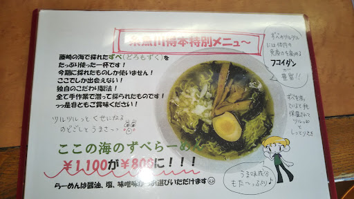 糸魚川得本掲載の「ここの海のずべらーめん」のオーダーです。 ズベらーめんは、近隣の竹春館で提供されていましたが廃業し幻のメニューとなっていました。しかし、見事...