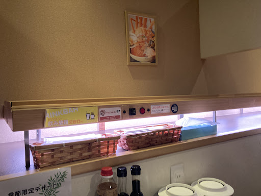 タッチパネルメニュー、テーブルにコンセントあり、フリーWifiもついてて、席にお手拭きやお箸、4種類の醤油、お子様のメニューやドリンクバーかあり、サービスが充実している印象。