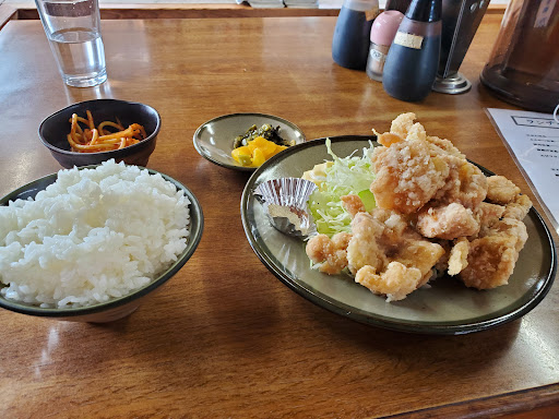 Read moreコメントが多かった唐揚げ定食を食べました。 片栗粉まぶして揚げたやつですかね。 そのままでも美味しく、塩胡椒かマヨネーズがあるので味変しながらさらに美味しく頂きました。 鶏もも肉使用。切れ込みいれてるのか、少し衣がかさまししてる感は確かにあり、5-6個と量も多いので最後らへんは油がきつかったです。 ご飯は普通盛でしたが、女性は少なめにしないと完食は厳しいかも?