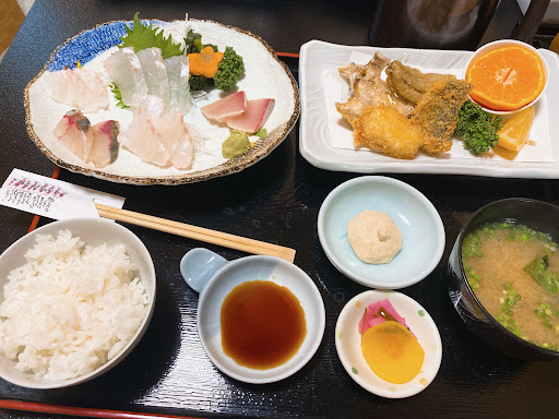 Read moreお昼も予約制ですが、当日電話しても快く入店出来ましたが、日曜日昼だからか満席で、1時間後しか空かないとのことでしたので、近くをドライブしていました。 今日はイカはありません、との事で残念でした。 ランチは手ごろな1,080円台の定食(一品と味噌汁、ごはん、漬物)と、2,160円の私らがいただいたセット(フライかあらだき+刺し盛り、ごはん、漬物、味噌汁)の2段階あります。 わたしは刺し盛りと魚のミックスフライのセット、夫は刺身とあらだきのセットに。