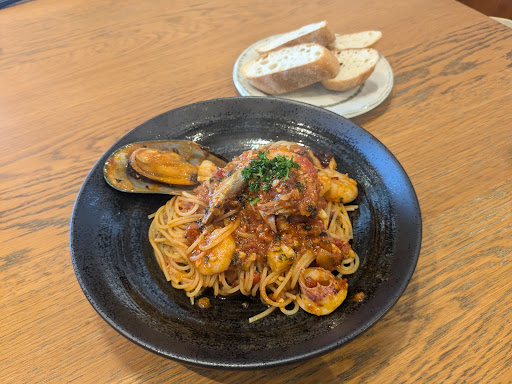 魚介のペスカトーレは魚介エキス濃厚でパスタはもちろんパンともあう!普段あまりパスタを食べないので、良い表現が見つかりませんが具だくさんで大満足でした。ランチの種類が豊富なのでその日の気分で選べるのは非常に良いですね。