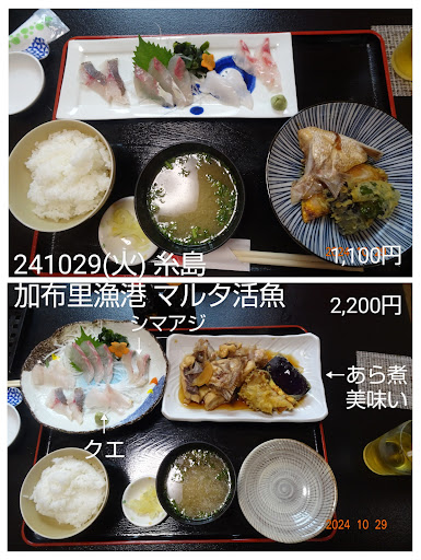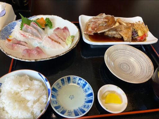 Read moreお昼も予約制ですが、当日電話しても快く入店出来ましたが、日曜日昼だからか満席で、1時間後しか空かないとのことでしたので、近くをドライブしていました。 今日はイカはありません、との事で残念でした。 ランチは手ごろな1,080円台の定食(一品と味噌汁、ごはん、漬物)と、2,160円の私らがいただいたセット(フライかあらだき+刺し盛り、ごはん、漬物、味噌汁)の2段階あります。 わたしは刺し盛りと魚のミックスフライのセット、夫は刺身とあらだきのセットに。