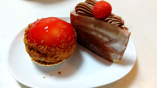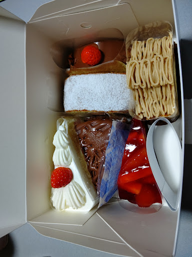 桃の時期になりましたので、桃のパイと桃のタルト購入。 昨年も桃のパイが気に入ったのでお高めですが購入。桃と中のクリームが合って美味しいです。 タルトの方も美味しかったですがパイの方が自分は好きです。 (前の投稿)レモンタルトは、夏向けに甘いですがレモンの酸味がいいです。上からメレンゲ、クリーム、ソース、クリーム、生地、タルト生地となってるので、綺麗に切ることができれば、断面図の層が綺麗に見えるかと。 トリフショコラは、上の三角部分がチョコなので少し甘かったけど美味しい。ふってあるココアが多いので、周りに飛ばないよう気をつけて。 (前の投稿)いちごタルトは、苺がいっぱいなのでお得感がいいです。クリームもカスタード系だったと。 コレ・ショコラは、濃厚なチョコと甘過ぎないクリーム二種があって美味しい。 季節限定のものも有るので通ってしまいます。 (前の投稿)今回購入した桃のパイは他のものより少し高く、また食べにくいですが、ほんと美味しかったです。 チョコ生もくどくない甘さで、ペロリと食べてしまいます。写真では見にくいですが、間にはちゃんとイチゴが挟まってます。 (前の投稿)お手頃なケーキが多く、今回購入したのは400円台でした。 写真忘れましたが、シュークリームは、注文してから中のクリームを入れてくれたのですが、シューがサクサクしていて美味しいです。 クリームも甘さが控えめでした。 イチゴの乗っているケーキ(ナポレオン)も間のパイ生地?がサクサクで美味しかった。 チョコレートのケーキの上に乗ってい...