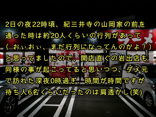と思ってましたので、開店直ぐの岩出店も 同様の事が起こってると思いつつ、ダメ元 で訪れた深夜0時過ぎ、時間が時間ですが 待ち人6名くらいだったのは肩透かし(笑)
