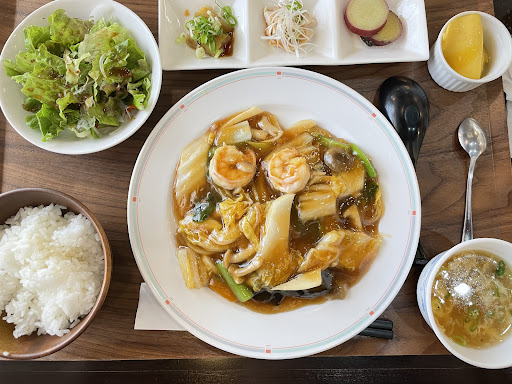 Read more美味しいとのウワサを聞きつけ、初めて訪れました✨外から見る感じは中華料理店っぽくないオシャレなカフェ風で、圧倒的に女性客が多かったです。入って正面にオープンキッチン🍳いい匂いが漂います。トイレ近くの席に案内されましたが、小さめのストーブが入口側を向いていて、コンクリ打ちの建物のせいか、私たちの席はなかなか足元が冷えました。調理を一人でされているため、料理の提供は多少待ちますね。温かいお茶が救いでした。 夫は油淋鶏ランチ、私は海老マヨランチをチョイス。前菜やデザートまで付いているのに、すごくコスパが良い👏白ご飯をプラス300円で炒飯にしましたが、こちらは好みは分かれるところでしょうね。私は椎茸も好きだし、シットリ系炒飯でも美味しいと思いました。パラパラ系が好みな人は微妙かも。海老マヨのソースがとにかく美味しくて、海老もプリップリでした🍤油淋鶏も、酸味控えめで美味しいと夫が言っておりました😅スタッフさんも丁寧な接客でしたし、またおじゃ...