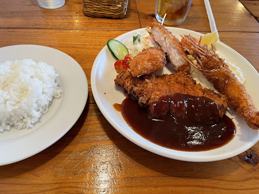 MIXフライをセットで頂きました。ポークカツはプリプリとした歯応えに肉汁が溢れ、海老フライはプリプリを超えた弾力でブリブリでした。カツに掛かっているデミグラスソースは濃い目味わいで美味しかったし、たっぷりのタルタルソースもタルタル好きにも満足できた。とにかく他の洋食屋とは一線を画す美味しさ。素材の良さを感じることができました。ただし、コストパフォーマンスがあまり良くない。MIXフライ、1,400円は物を考えれば妥当かもとは思ったが、ライスとサラダと飲物が付いたセットで、600円はいかがなものかと思った。MIXフライを食べようすると、合計で2,000円要ります。それだけの金額を支払ったにもかかわらず、出てくるのは驚くほど少ない量のご飯と、ありきたりなサラダ、そして烏龍茶である。ちょっと舐めてるだろ?って思った。そうでなければ、特別な信念があって嫌がらせにやってるとしか思えない。そのくらい、あり得ないお粗末さです。ほんと好みの味で美味しかったんだけど、その辺...