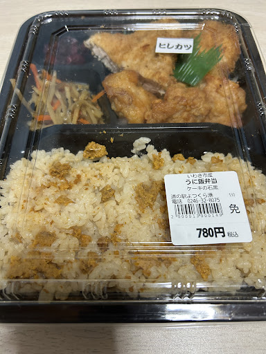 こちらの名物と言えば大川魚店の「ほっき飯」・ケーキの石黒の「うにめし」・松喜の「ソースかつ丼」。ショーケースを見ると~うにめし弁当はご飯単品380円・ヒレカツが入ったものが780円とウニを使った商品としてはリーズナブル。