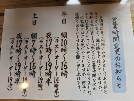 土日は朝7時から営業している貴重な朝ラーのお店。 令和6年4月現在、添付写真の通りの営業時間のようです。