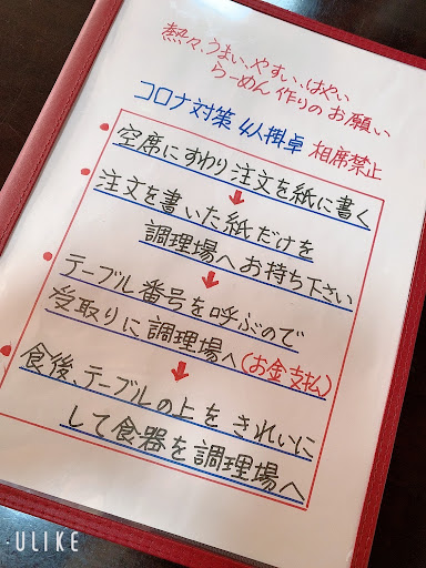 Read more何種類もの塩をブレンドした「塩ラーメン」がオススメです。毎日通っているという常連さんに教えて貰いました。700円でボリュームもあり、トッピングも充実しているので、サイドメニューがいらないぐらいの食べ応えがあります。 少し変わったセルフサービス式なので、手順を紹介しておきます。 ①番号が記載してある紙に、食べたいメニューを自分で書いて調理場へ ②料理が出来上がったら、スピーカーで番号を呼ばれるので、自分で調理場へ取りに行きます。 ③調理場にて、料理と交換で料金を支払います。 ④食べ終わった食器は、調理場へ自分で持って行きます。テーブルをふくふきん等がなかったのですが、お盆に乗せて渡されるので、汚れている感じはしません。帰りに飴が貰えます。