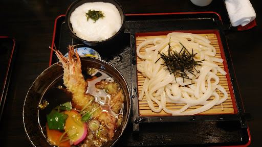 Read more2019/2訪問 北茨城で夕飯にしようと言う事で、国道6号線を北上。 中々好みのお店が見つからずにいたら、とんかつの文字が。 そばもうどんも有るようなので、こちらにしました。 車がたくさん止まっていたので、人気店なんですかね。 入口入ってすぐの、3人掛けのカウンター席の様な所に陣取り、メニューを確認。 揚げ物やそば、うどんなど結構豊富なメニューなので、大人から子供まで客層の幅が広いですね。 主人は、小天丼のざるそばセット。 私は、つけ天うどん。(天ぷらが入った温かい汁に、冷たいうどんをつけて食べる) どちらも1400円。 こちらのお店、お客さんがそれなりに入っているにもかかわらず、提供が早いです。 10分待っていないと思います。 私のつけ天うどんは、腰の強いちょっと太めのうどん。 エビ天とかき揚げが入っている温かいつけ汁に浸けますが、つけながらではなく、浸けとけって感じで食べた方がいいかも。(レンゲを付けて欲しい) そして食べ進めると、汁の中に何か物体がある! 何だろうと持ち上げると、サツマイモの天ぷらでした。 とろろご飯は、いまいちです。 とろろは出汁で溶いている分けでは無いのと、ご飯がかなり温いです。 ですが、大衆受けする感じの味付けで種類も豊富なので、食事時に通っ...