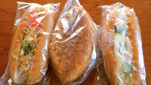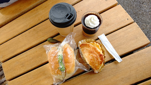 昔ながらのパン屋さんの品揃えです。 購入したのは、ハムサラダパン、アップルパイ、コーヒーゼリー。(写真内の紙コップコーヒーは別のお店のもの) 他にもシュークリーム、ラスク、ゴボウパン、焼きそばパンなどがありました。 どれも美味しかったですが、特にコーヒーゼリーが苦味が少なく、下がカフェオレのクリームになっており、とても美味しかったです。