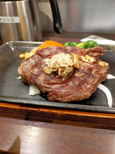 Read more初めてのいきなり!ステーキ訪問。 店員に案内されるまで中に入ってはいけません。同伴者が分からずに入っていくと店員から大きな声で注意されます。 席に着くと店員さんから番号札を渡され(テーブルに置かれ)それを持ってレジへ。 メインを決めると、レアをお勧めしています。と言うので、じゃ、レアで。と回答。 セットをどうするか聞かれ、ご飯は大盛り·普通·少なめのどれにするか聞かれ、それを応えてお会計。 出来上がるまで席で待っていると、店員さんが紙エプロンをしているか確認しに来てから10分位待って到着。 私なトップリブ150gとご飯少なめ。 筋は何故か多め。切りにくい。 切れやすかった部位は、じゅわっと溶ける感じ。 お肉は卓上にあった塩で。 ぺろりと完食。 肉も美味しかったけど、1番美味しかったのは付け合せの人参。 甘くて柔らかくて美味しかった。 ご飯はあまり美味しくない。 (多めにしても少なめにしても値段は変わらず)