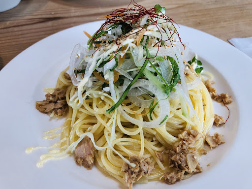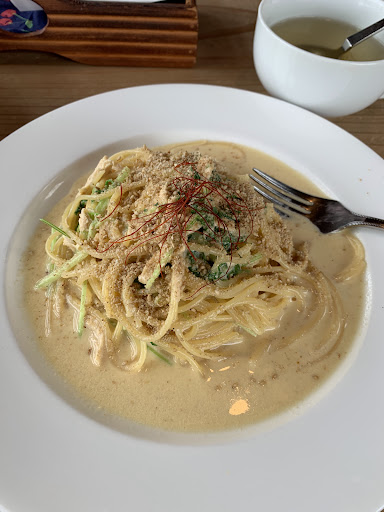 Read more職場の同僚のおススメのお店ということで、主人と2人でランチに伺いました。人気のお店ですぐに駐車場がいっぱいになると聞いていたので、開店直前に着くように行きましたが、予想通りみるみるうちに満席になりました。日替わりランチのドライカレーチーズ焼きとささみとゴマの和風カルボナーラを1つずつオーダー。店内は清潔で木の香りが気持ちよく、出されたお水はほのかにレモンの香りがして所々にこだわりが感じられました。サラダはシャッキリ新鮮でドレッシングもありきたりな味ではなく柑橘のさわやかな風味で美味しかったです。スープは野菜と肉の自然な優しい味付けで化学調味料が一切使われていないような感じがしました。メインは綺麗に盛り付けられていて、麺の茹で加減も絶妙。コクがあるのに重くない素材の味を最大限に活かした一品でした。主人のランチのコーヒーもわずかな酸味が心地よく、クリームをのせていただきましたがそれに負けない薫り高く新鮮な味わいでランチにこのコーヒーが付いてくるなんて贅沢なぐらいでした。私の方のオレンジジュースはジューシーで果肉が感じられる100パーセントのものでした。さらにデザートが!手作りだと思われるさっぱりとしたミルク寒天にブルーベリーの美味しいソースが乗っていました。全体的にヘルシーなランチメニューで850円、コスパ最高ですしお味もハイレベルなもので接客もクレンリネスも申し分なく、またすぐにでも来たいお気に...