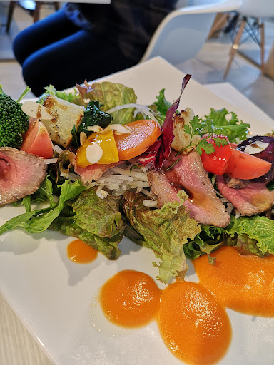 初めての利用です。以前から気になっていたので訪問させていただきました。駐車場はお店の前に4.5台と、ちょっと離れた隣?にあったみたいです。店内は白とグリーンでとても明るい雰囲気です。一人で入りましたがピークが過ぎたのか、4人テーブルに案内して下さいました。コロナ対策でテーブルごとに大きなビニールできちんと区分けされていました。ただ少し換気が不十分ではないかなという空気感でした。 やはり沢山お話されているかたがいる時には心配です。メニュー、注文はiPad使用。 メニューをみてびっくり。高い😰私も色々なカフェいきますが、新鮮なお野菜推しなのかもですが、ハンバーグランチ1980円。どれほど美味しいのかなーと注文してみました。デザートまで入ってこのお値段。店員さんは明るく清潔感ある優しい対応です。色々小鉢がつくのですねー。ひとつの木目調のトレーにのせられて提供です。思ったよりハンバーグの主張が弱い。たべてみるとお肉が上質でいい香りがします。ただ残念なのが上にかかったソースが片栗粉でとろみがついてせっかくの旨味が強さに負ける。ジューシーさが味わえない。これは本当に残念。もうこの時点でお値段に合わない。材料がいいので、もう少し工夫が必要だと思います。お野菜も美味しいのに少ない。色々小鉢食べていると味が混在してんーとなる。せっかくのお値段ならサラダ、スープ、メイン、デザートと出してみたら贅沢なハンバーグランチになるきもしますが、お店の都合もあるので。今回は...