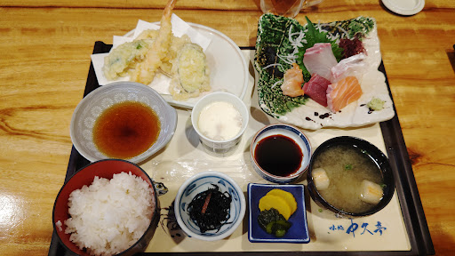 Read more自分と妻で同じく刺身と天ぷらセット1848円(税込)を注文しました。まあまあの値段なので内心どーかなぁと想像しながら出てくるのを待ちました。値段以上の美味さでした。船釣りが趣味の自分は釣れたての魚をいつも捌いて食べているので特にお刺身には舌が肥えているのですが、驚きの美味さでした。ブリ?ハマチ?分かりませんが歯応え抜群。鯛?石鯛?は身が透き通ってました。 天ぷらもサクサクでナス、レンコン、さつまいも、エビ、ししとうで美味しかったです。 茶わん蒸しやお味噌汁も出汁が美味しく小鉢も付いていてgood。次は天丼を食したいと思います。ただ一つ駐車場が停めにくく一度通り過ぎて反対側から停めました。そんで星マイナス1...