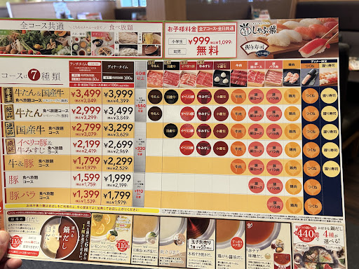 A delightfully roomy and comfy shabu shabu restaurant. Meat sets dictate the price you pay, ranging from pork shoulder and belly, ground chicken and selections of beef, with sushi options at dinner. Broth selection is normally served with one broth being a salt and seaweed broth, then your choice of one of 6 other broths, OR you can pick both for an extra ยฅ100. Noodles and veggies are self-serve with many different dipping sauces to choose from, the drink bar is expansive and only a few hundred yen more, and the desserts (included in all-you-can-eat prices) sections has an ice cream machine, waffle irons, and toppings from maple and chocolate syrup to fruit syrups of all different colors. Service is friendly and accommodating, even to non-Japanese speakers, would...