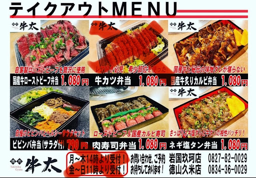 【テイクアウトで利用】 岩国市玖珂町にある焼肉店。食べ放題コースもあり、地元では人気があるみたい。 ■利用時の状況 ・日曜日の18時30分に、テイクアウトで弁当を利用しました。 ・受け取りに行った時はすでに満席でとても忙しそうでした。 ■注文内容 〇国産牛ローストビーフ弁当、国産牛炙りカルビ弁当、ネギ塩タン弁当を各1つずつ ■場所・アクセス 最寄り駅からは近くない。駐車場はドラッグストアとの兼用みたいなので、ある程度ある。 ★感想 ・あくまでテイクアウトのみの感想なので、食べ放題とはちがいます。 ・ご飯の量はそこそこあります。味はそれぞれまあまあおいしい。 ・牛カツ弁当を注文したら現在はやっていないとのことでしたので注意してくさい😔 ・ランチはもうやっていません😕 ・電話受付も16:30以降でないと、出ません😔 ・電話注文時に、18:30で依頼したら、「その時間帯は忙しいので、頑張ってみます」と返答された。できるのかできないのか不安だった😩