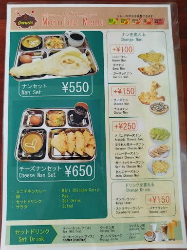 徳重・名古屋芸大駅のインドカレースルチの2号店ということで、モーニングで訪問しました。モーニングメニューは2種類で、チキンカレー、サラダ、ドリンク(選択)は共通で、プレーンナンかチーズナンを選べます。 プレーンナンの場合は550円、チーズナンの場合は650円と破格の安さです。(モーニングは9:00〜11:00)