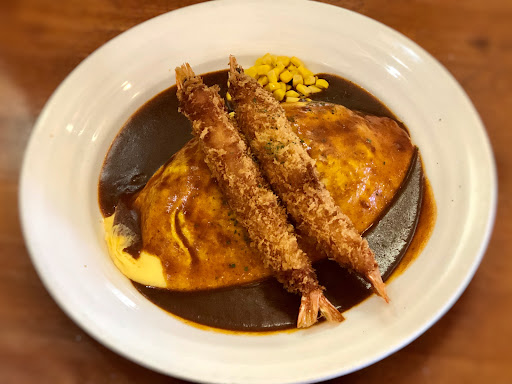 玉子はフワッとライスを包むタイプ。 たっぷりのデミグラスソースのに有頭エビフライがのせられた美味しそうなオムライスです。 エビフライはちょうど良い一番美味しい大きさです。 フワッと玉子にチキンライス、デミグラスソースが良い感じにマッチしています。