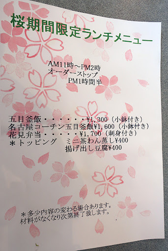 Read more*ご注意 桜まつり期間中はメニューを絞ってますし激混みだし手が遅いです。店員さんテンパってます。どうかそのおつもりで。 「五条川 桜まつり」期間中のランチ訪問。いつもの「みのや」さんが開店前だったのでやむなくここに入る。職場が近かった昔から「お値段ちょい高め」の印象しかなく、ここでの食事は何年ぶりか。 カウンター6席ほどと4人掛け卓X2・一人掛け卓ひとつ。奥には座敷あり。 ギリギリ空いてた卓に座って「花見弁当」を注文。予想通り作り置きばかり?のせいか、他の客の「釜飯」より短時間、約10分で来た。 後から後から来客があるが店員は中の客への応対で手一杯。戸を開けたまま、食べてる人の背後で数人が立って待ってる状態。何組か諦めて帰ってからようやく店員が名前記入の紙を持ってきて「時間掛りますよ」と念を押していた。そんな状態なのでおちおち料理を味わえず。ま、「お値段なり...