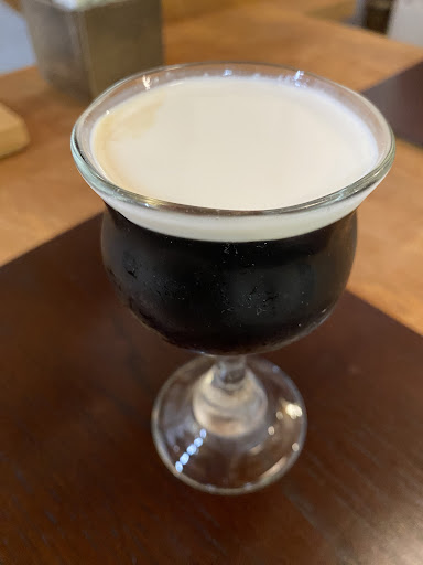 以前から気になっていた岩井窯の帰りに立ち寄りました。 店内はテーブル席が3テーブル程あったと思います。 訪問時間が15時前だったのでアイスコーヒーで良かったのですが、メニューにお菓子風冷たいコーヒー800円が目に止まり頂く事に。 何やら深煎りコーヒーに和三盆糖のやさしい甘さを加えて、生クリームを浮かべてワイングラスで提供されるようです。 少々お時間を頂くとの事でしたが15分程度で提供です。浮かんでいる生クリームを混ぜないでそのまま飲んで下さいと説明がありました。 一口頂いた感想です。 温くて甘いです。 確かにお菓子風なのは分かりますが、個人的にはもう少し甘みを抑えても良い感じがしました。 本来の深煎りコーヒーの濃さが味わえないので氷を入れていないのは仕方ないのか… コーヒーを冷やす時間がかかるので致し方ないのか...