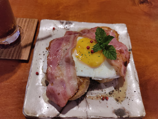引き連れ初襲撃。 店の外観的な佇まい、内部の雰囲気共に素晴らしい。 ここに行った時は「これ」と一応は決めていましたが、しばしメニューを眺める。 まずは量感を聞いてみる。 少なくは無さそうだが、いわゆる汁物が付いて来るわけでは無いので、 一時的な体重増も許容範囲だろう。 というわけでフレンチトースト あまい方¥800 しょっぱい方¥900 アイスコーヒー¥500 を注文。 15分ちょっとぐらいで、しょっぱい方 やや置いて、あまい方が出来上がってきた。 どちらとも3センチほどの厚みのフランスパンが2枚、 そこに、しょっぱい方は目玉焼きとベーコン、 しょっぱい方はバニラアイスとベリー&ベリーソースが盛り付けられている。