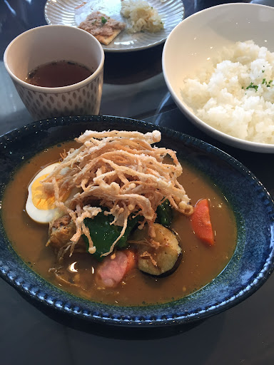 Soup curry lunch comes with rice, marinated onion, carrots coleslaw, soup and drink ¥1,100 Their blue cheese pasta was also my recommendation.Nice atmosphere and friendly service. There are interesting second hand books. I truly recommend a cup of hot coffee master dripped! I’ll have it...